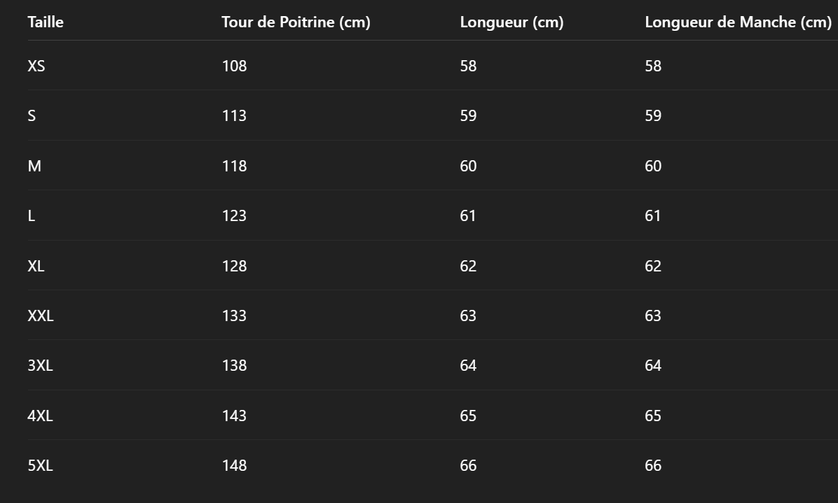 Taille Tour de Poitrine (cm) Longueur (cm) Longueur de Manche (cm)