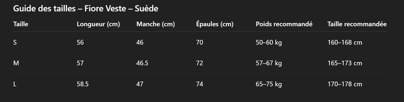 Taille | Longueur (cm) | Manche (cm) | Épaules (cm) | Poids recommandé | Taille recommandée |