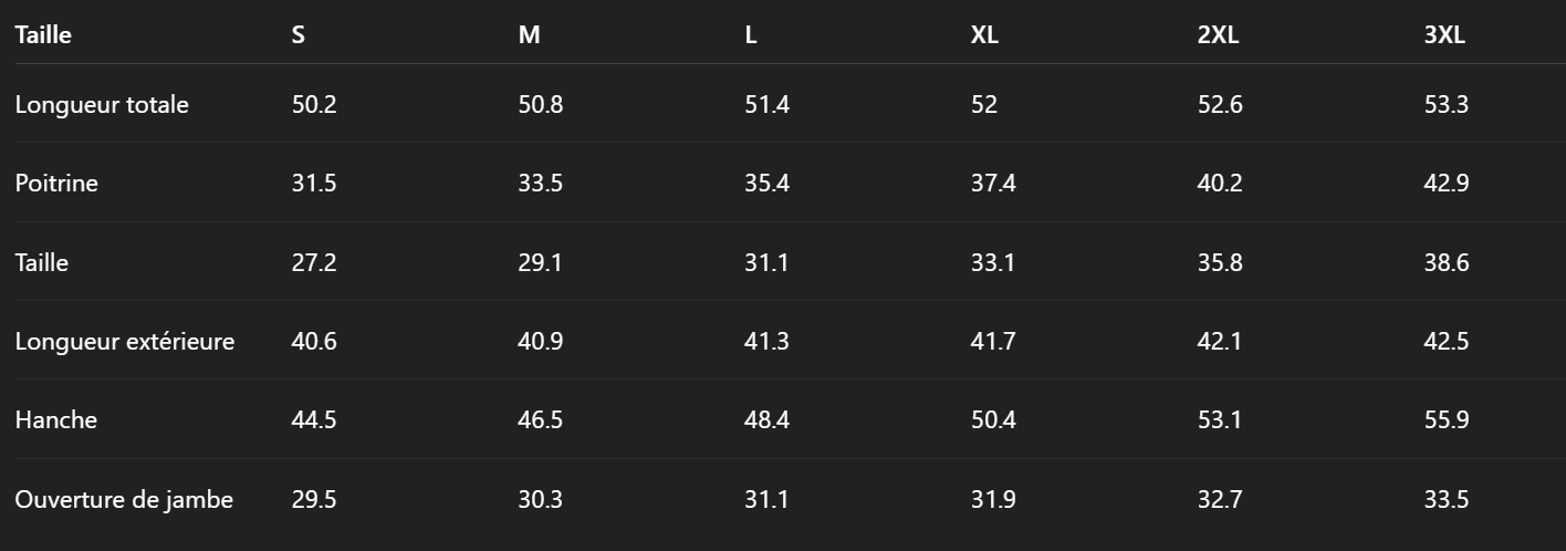 Poitrine | 31.5 | 33.5 | 35.4 | 37.4 | 40.2 | 42.9 |