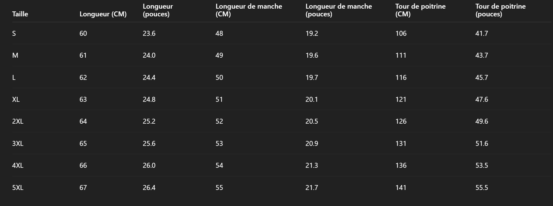 Taille Longueur (CM) Longueur (pouces) Longueur de manche (CM) Longueur de manche (pouces) Tour de poitrine (CM) Tour de poitrine (pouces)